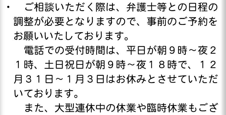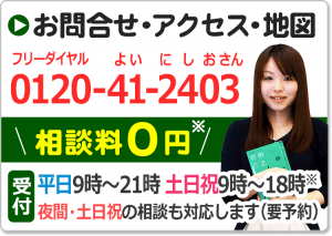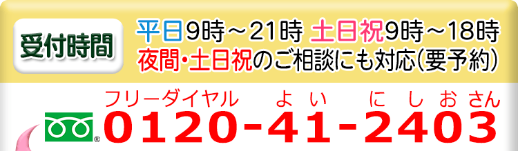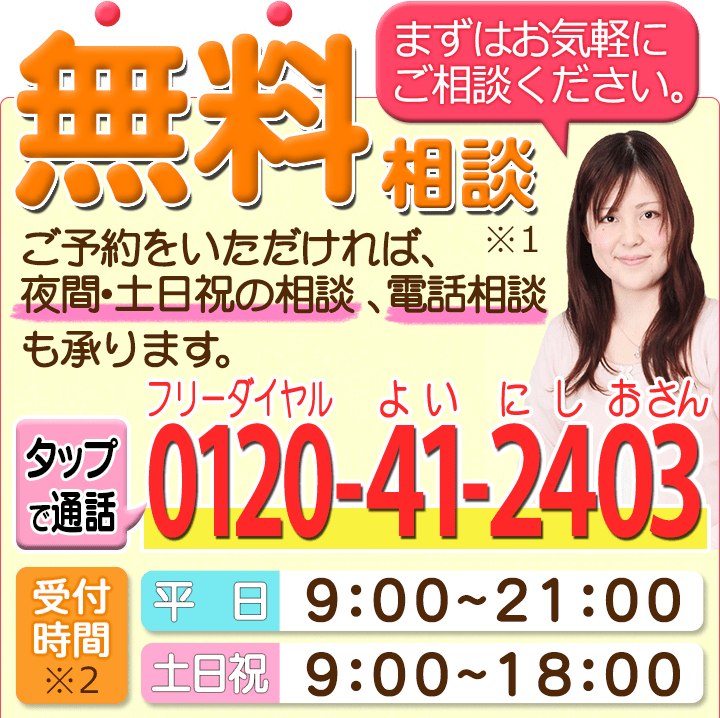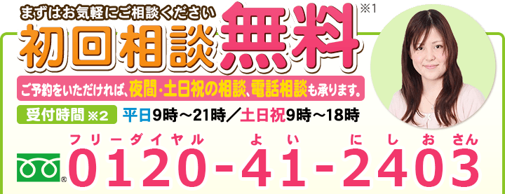 ご相談の日程も、平日夜間や土日祝を含めできるだけ柔軟に対応させていただきますので、まずはフリーダイヤル・メールフォームからお問い合わせください。