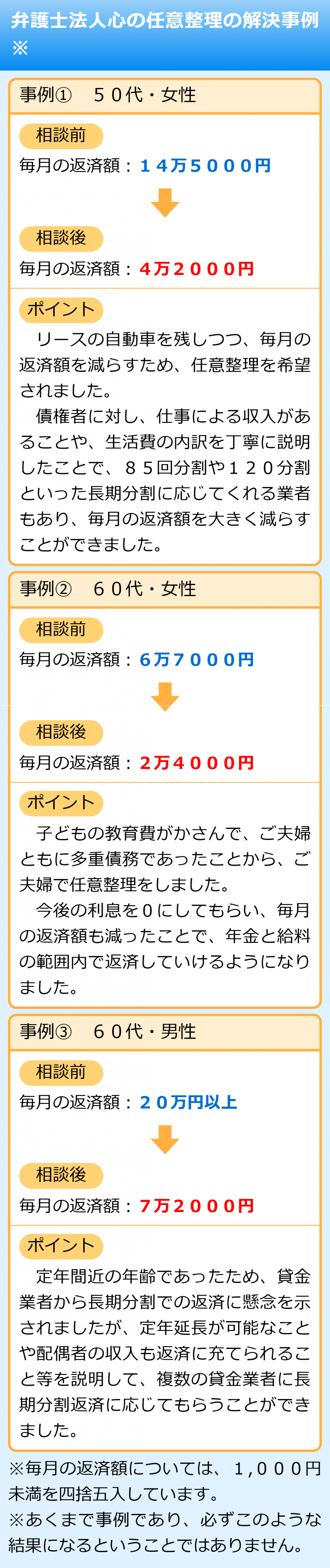 多くの場合、返済期間を長期間にして1回ごとの返済金額を減らしたり、将来利息をカットして今後は支払った分だけ借金が減っていくようにしたりといったことができます。