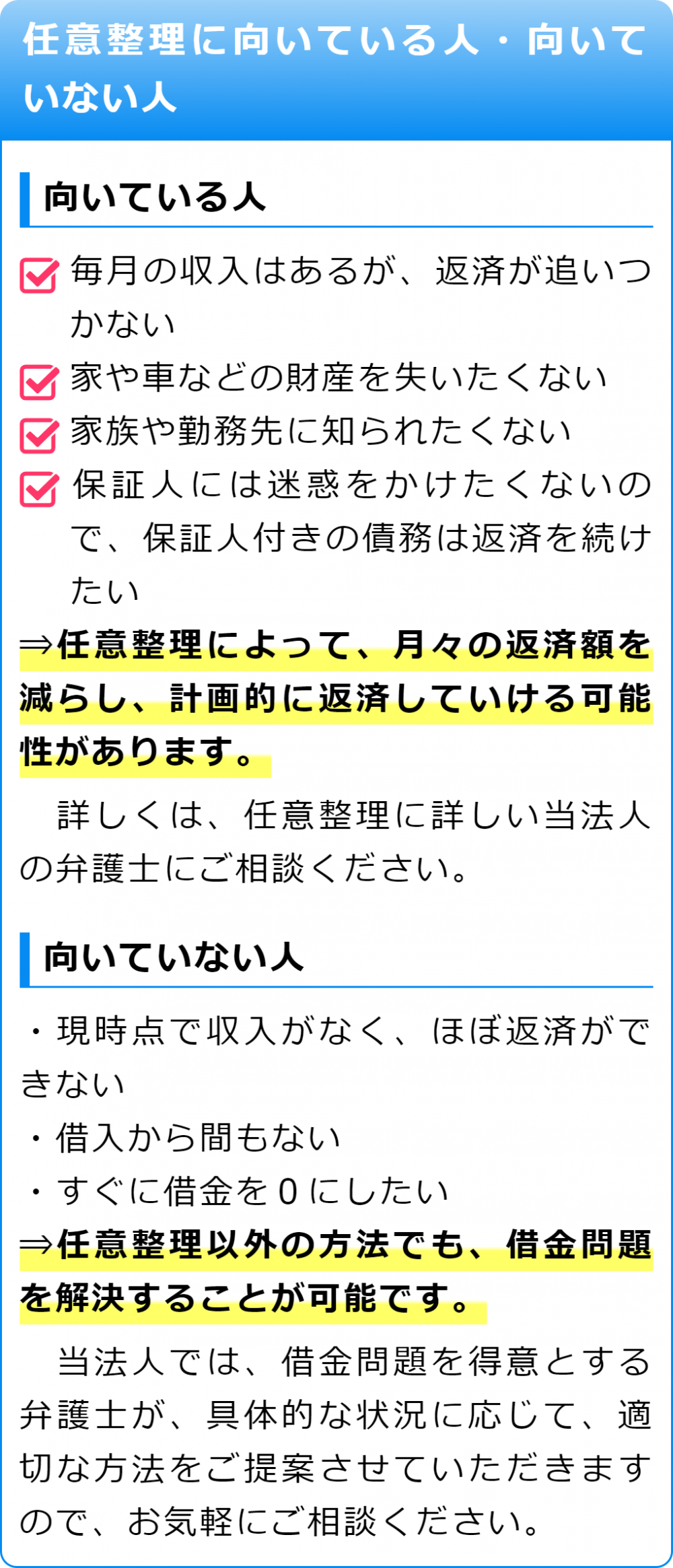また、普段から借金のお悩みに数多く対応してきている弁護士から見て、任意整理をした方がよい状況にあるかどうか、アドバイスをさせていただくことも可能です。