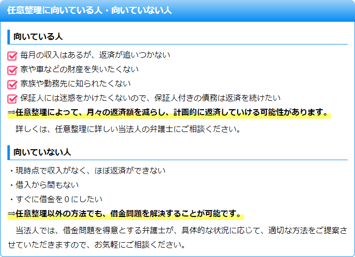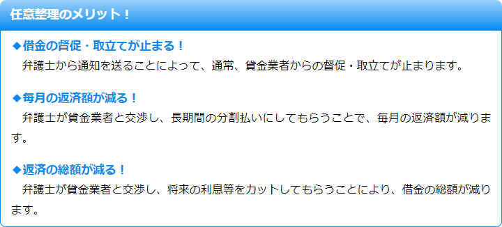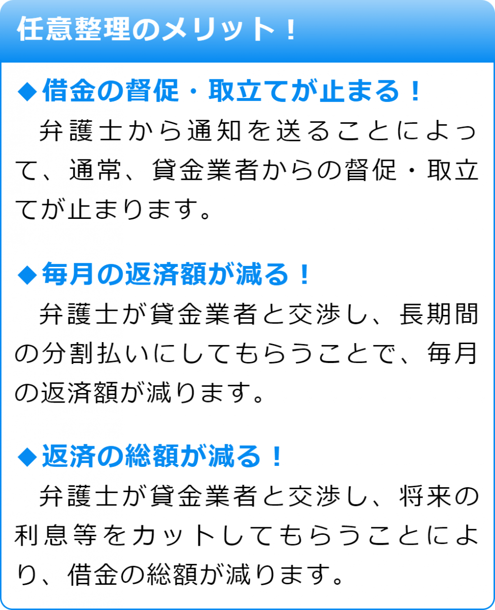 主なメリットとしては、裁判所に申立てて行う手続きに比べてお客様のご負担が少ないこと、一部の債権者とだけ交渉することもできるので、支払いが可能であればローン返済中の自宅や車を手放さずにすむことなどが挙げられます。